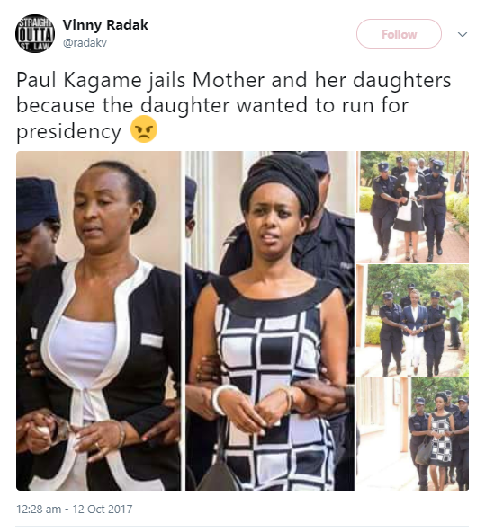 Vinny Radak took to Twitter to share the news, writing: “Paul Kagame jails Mother and her daughters because the daughter wanted to run for presidency.”