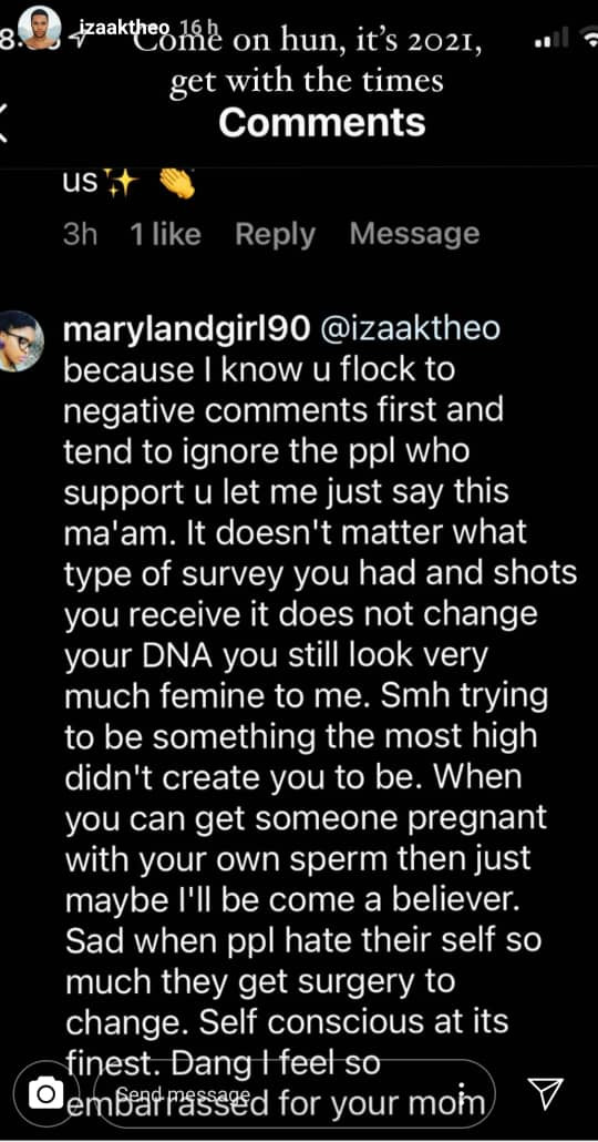 An Instagram user who apparently didn’t like the post, left a negative comment under it, stating that she is ’embarrassed’ for Izaak’s mum, Sade. Izaak screengrabbed the comment and shared it on his Instagram page, asking the IG user to move with the times as this is 2021. See the post below…