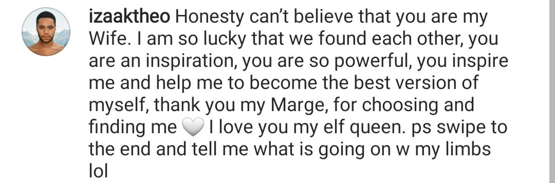 ”Honesty can’t believe that you are my Wife. I am so lucky that we found each other, you are an inspiration, you are so powerful, you inspire me and help me to become the best version of myself, thank you my Marge, for choosing and finding me. I love you my elf queen.”