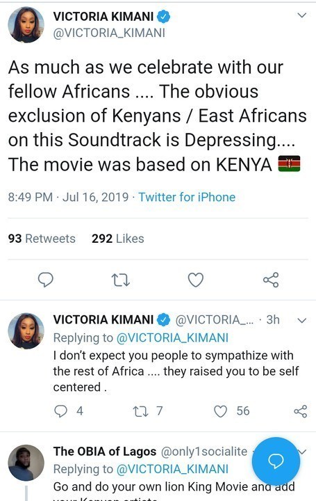 Kenyan born, Nigeria based singer, Victoria Kimani has reacted to the exclusion of the Kenyans and other East Africans artists from The Lion King, ‘The Gift’, the new companion album spearheaded by Beyoncé for the forthcoming Lion King.